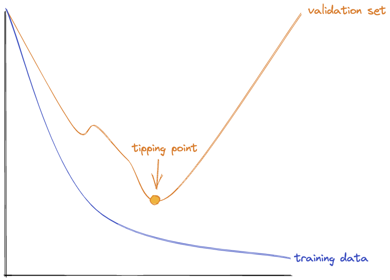 At some tipping point the training data’s boundary will become so sophisticated it cannot be generalized. To find this tipping point take a general average and find when the validation loss starts increasing.