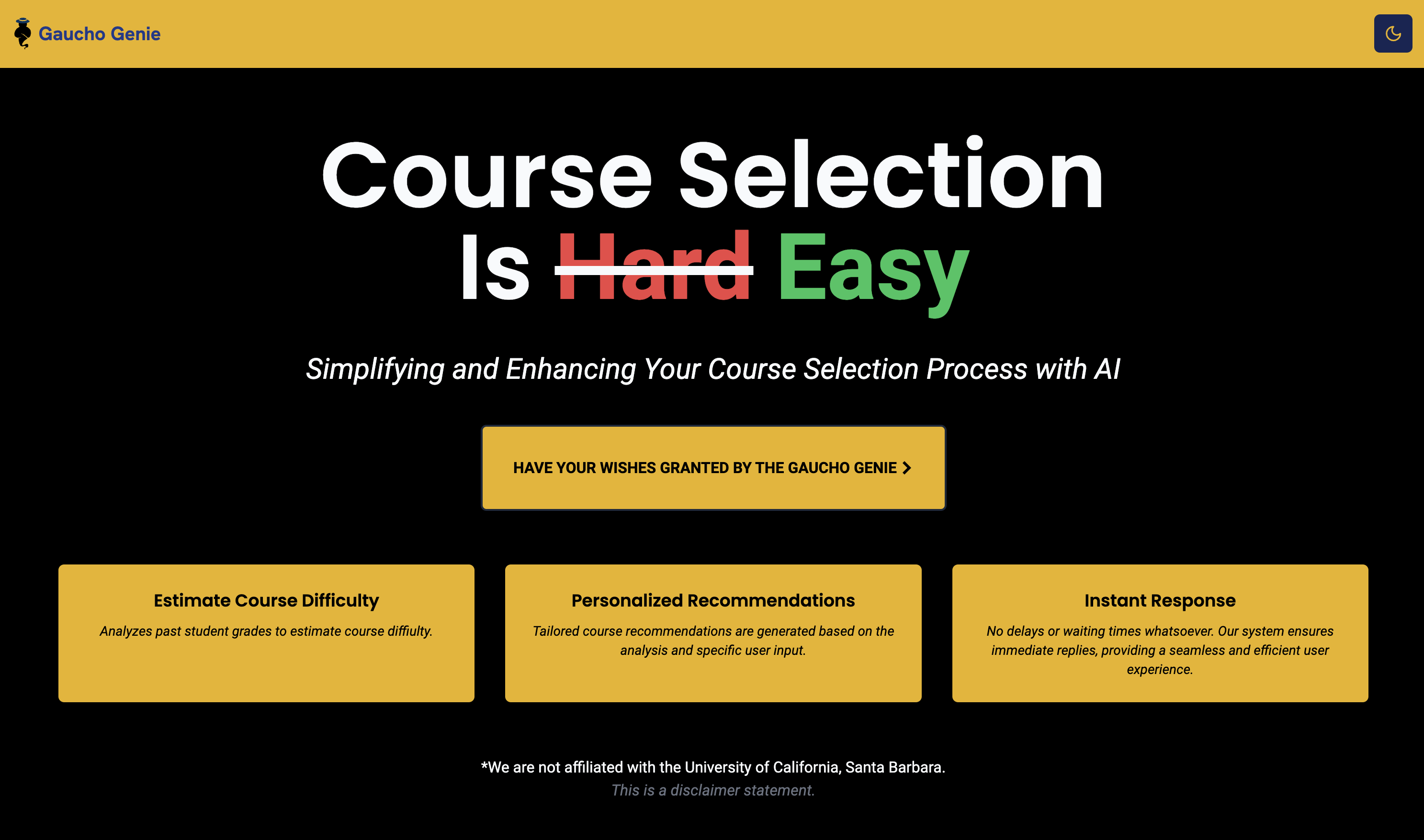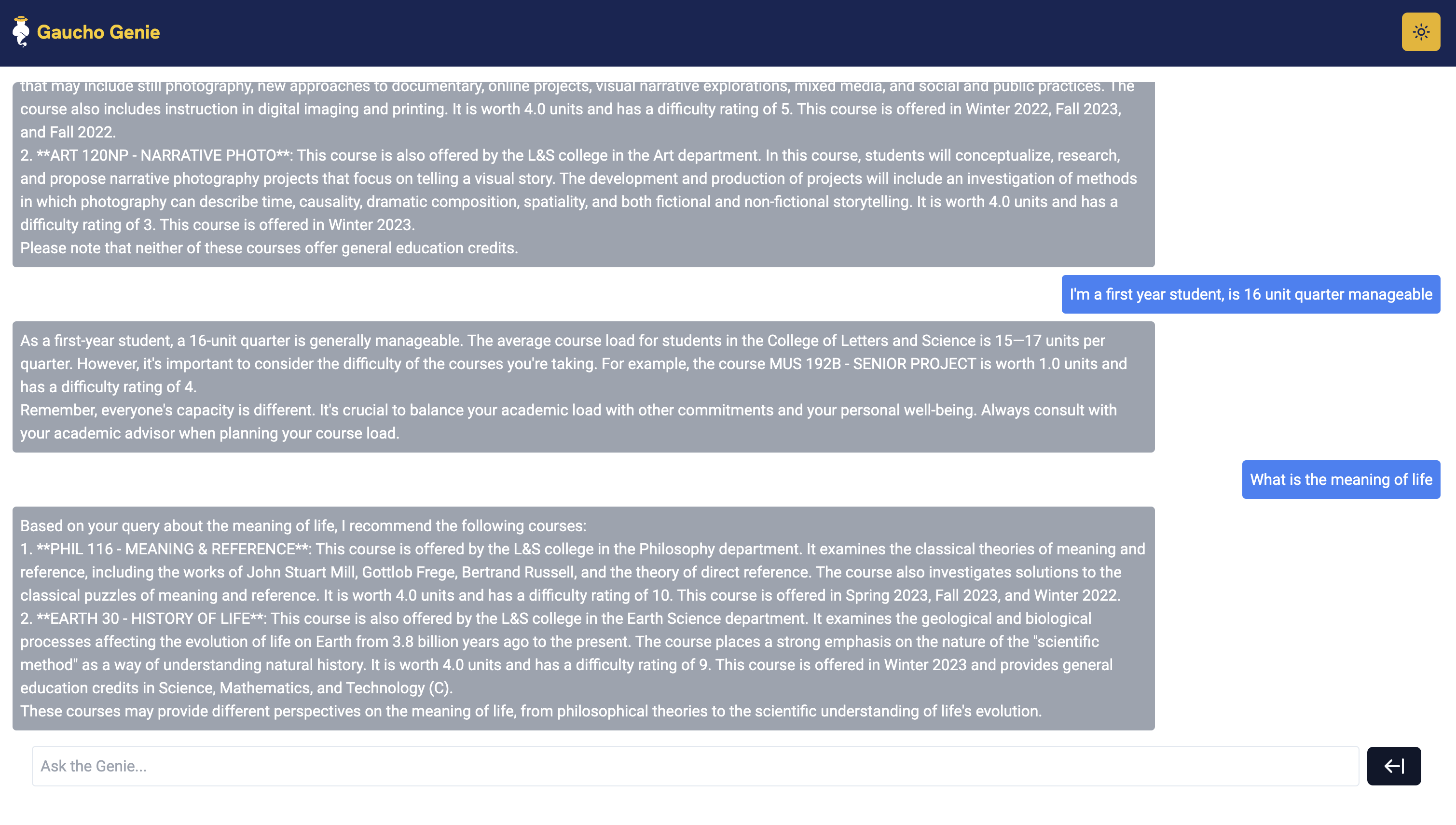 We plan on continuing to develop Gaucho Genie: increasing it knowledgebase, deploying it on a production website, improving UI (homepage has some clarity issues), and adding new features.