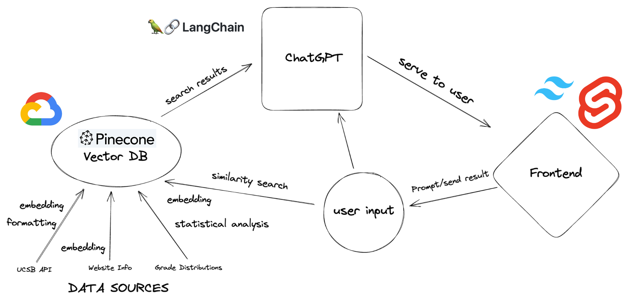 To build a knowledge base for our advisor, we pulled over 9000 course offerings from the UCSB API, analyzed and reformatted them to enhance their semantic clarity, then utilized OpenAI’s embedding engine (ada-002) for embedding. After embedding, we stored them in Pinecone’s vector database allowing for efficient and accurate semantic searching via cosine similarity. We also created a unique difficulty statistic by parsing the UCSB grade distribution dataset made available by the Daily Nexus. We then used Retrieval Augmented Generation to allow ChatGPT to utilize our knowledge base when responding to questions.